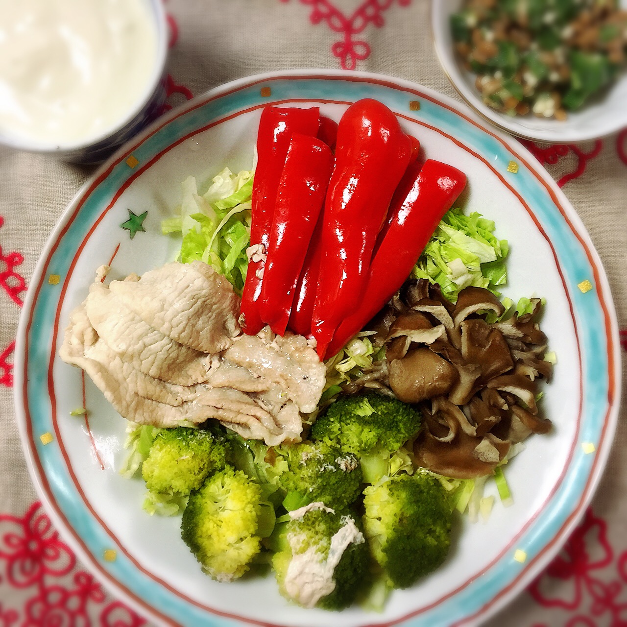 夜の豆腐マヨネーズ、おススメです。水切りしたお豆腐と、油とお酢とお塩をブレンダ―で混ぜるだけ。